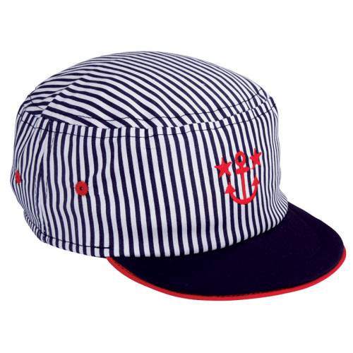 cappellino bimbo modello cambogiano a righe navy/bianco verticali con visiera navy o bianca con piping dettagli e finiture in rosso e occhielli rossi ricamo ancora in rosso nella parte frontale.Dettaglio: 46/6 48/6 50/6 52/6