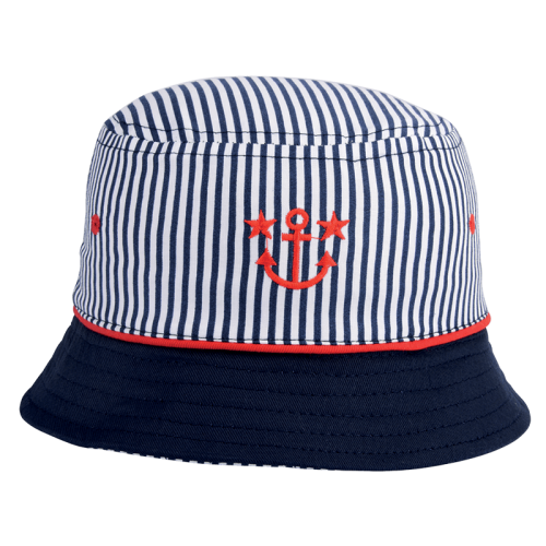 cappellino da bimbo con testa a righe alternate bianche e blu verticali ala tinta unita navy o bianco piping e dettagli in rosso. ricamo ancora sulla parte frontale