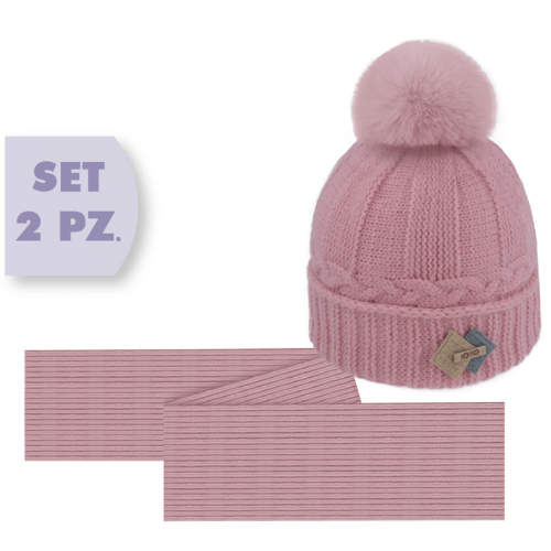 set 2 pezzi cuffia a maglia con risvolto ed applicazione pon pon in morbida ecopelliccia ed interno in jersey sciarpa a coste abbinata.Dettaglio: one size